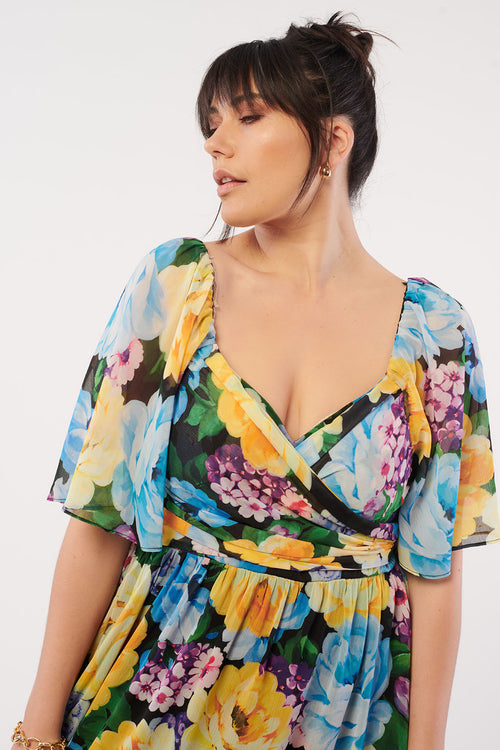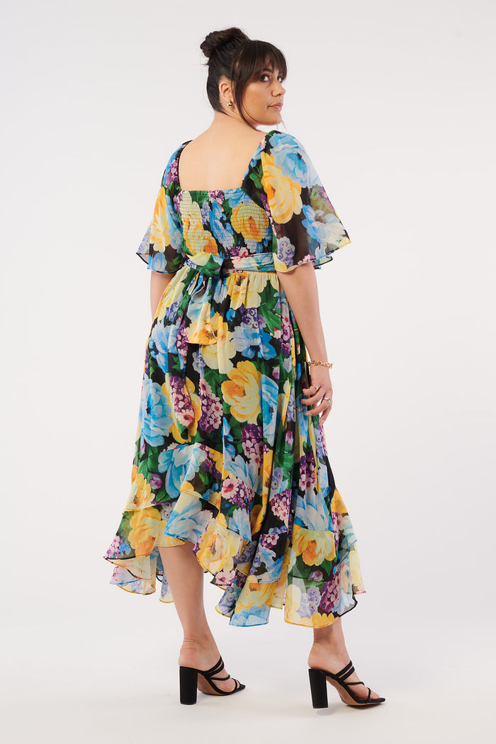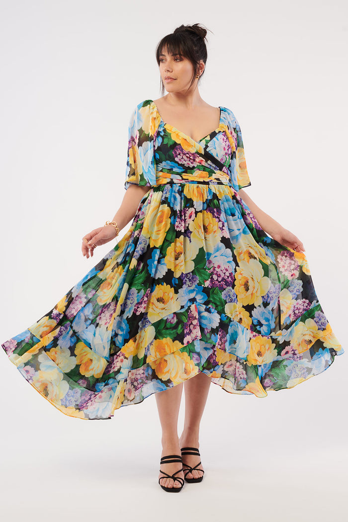 Introducing a new style for Novella, The Hydrangea Adjustable Wrap Bodice Dress. Float through a floral fantasy daydream in this beautiful English Garden print. It’s got a hanky hemline, with an adjustable wrap-style bodice and shirring across the back. The sweetheart neckline gives you full bust coverage. It’s got an elastic waist for comfort, and the circle-cut flowy sleeves and ruffles at the hem are perfect for catching a sweet summer breeze.