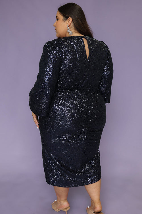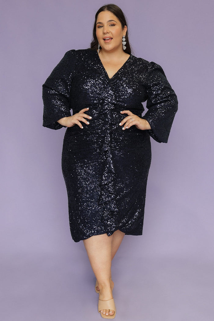 The Sienna Sequin Midi Dress combines the best of our beloved Bacio and Moment dresses. This fully lined midi-length wiggle dress is adorned with midnight blue sequins, and features Novella’s iconic ruching. Its v-neck allows full bra coverage, and the ruffle down the centre front adds some extra drama. It has full-length blouson sleeves with an elastic cuff, creating a romantic silhouette, leaving a trail of magic and compliments behind you.