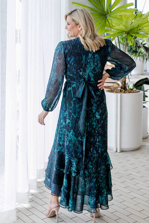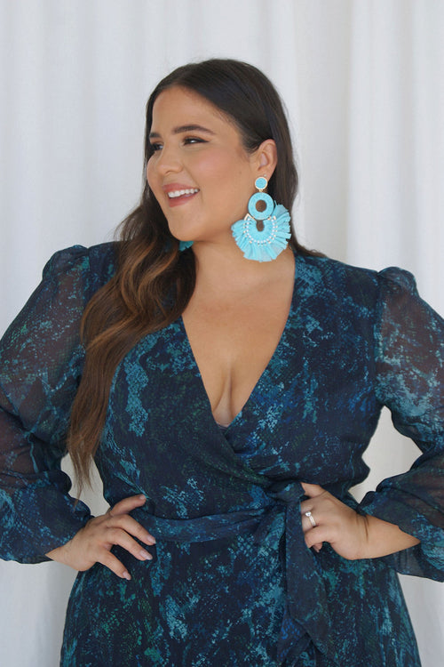 Summon your own J-Lo inspired showstopping moment in this exotic wrap dress. The high low skirt cascades tumbling ruffles around a hemline that delightfully dance around you. With billowy elastic cuff sleeves and sans waist seam you can wrap and adjust this enigmatic dress your own way.