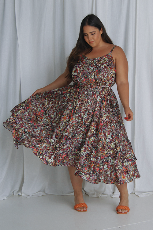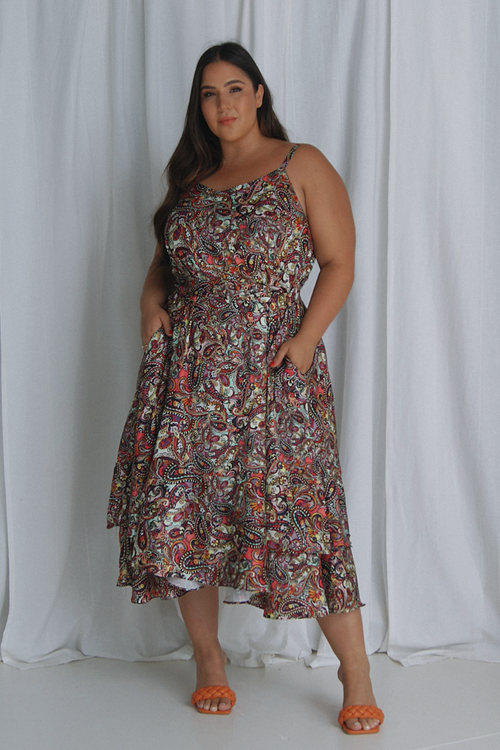 This V neck column midi dress is going to be your wardrobe staple. The bohemian style print dances around your body while the lightly ruffled hemline cascades around you in delight. Gitana comes with two belt options for you to alternate your look with. A traditional belt with gold eyelets and buckle or a fringed sash belt for more exotic styling or to wear in your hair and California dream with. The straps are fully adjustable and best of all, she has pockets!