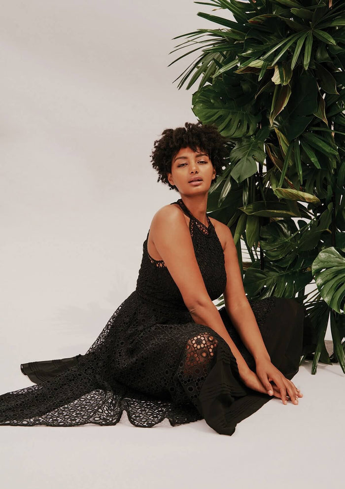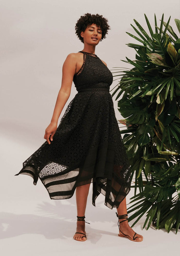 If you've been searching for a little black dress with an exotic twist, this is it. The fully lined black, traditional lace knee covering dress is romantic and easy to wear while the mid length hanky hem skirt is full, flowy and fun. The halter neck, waisted bodice finishes the flirty silhouette off beautifully. Dressed up or down, this LBD is made for dancing the night away.