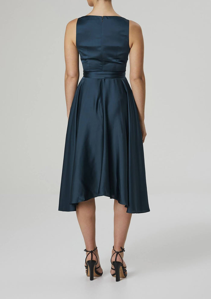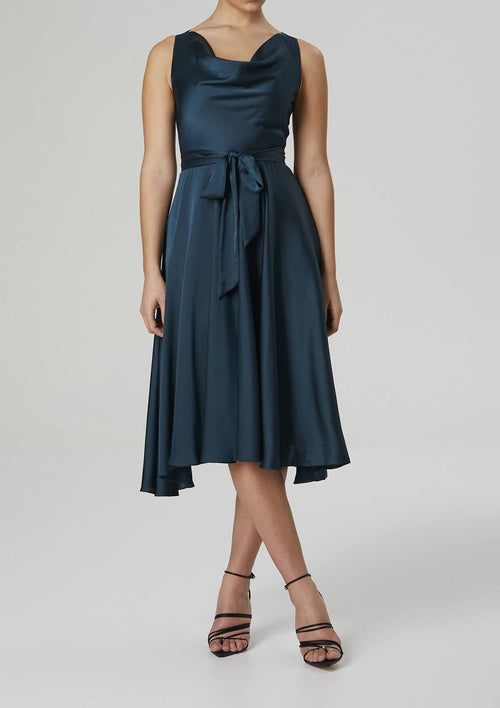 The elegant cowl and flare skirt of this dress creates the most classic of silhouettes. Reminiscent of Hepburn, this classic style is perfect for an understated bridesmaid or any special occasion. The silky fabric falls gracefully to flatter any shape. A tie waist detail finishes the simple look or switch it out for a tie or belt of your choice to customise your outfit. The silky fabric and thoughtfully styled, sleeveless bodice are made with your comfort in mind. This dress is so easy to wear. Available in the beautiful gem tones of teal and plum wine.