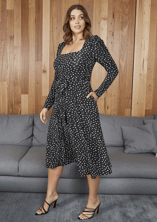 Snowdrop Square Neck Knit Midi Dress Black and White Confetti Print