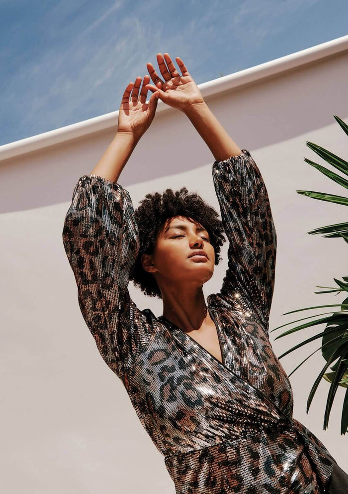 Shine bright like the star that you are in this super sexy mini. Covered in leopard print sequins, this dress is designed to stand out. The fixed wrap design features a ruffle detail at the waist and skirt that's flattering and fun. The full-length sleeves are gathered at the shoulder, ending with elastic cuffs to create a glorious billowing effect reminiscent of disco-era dance floors.