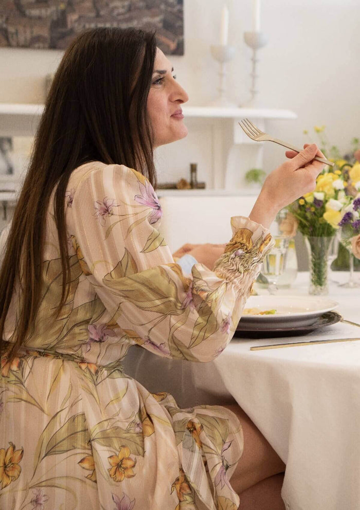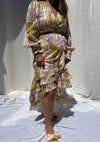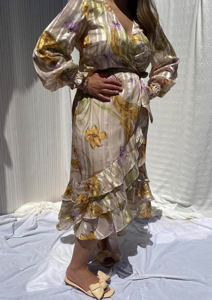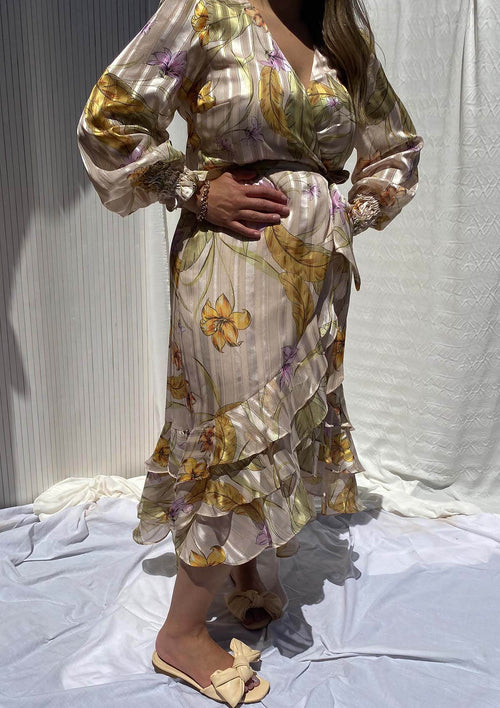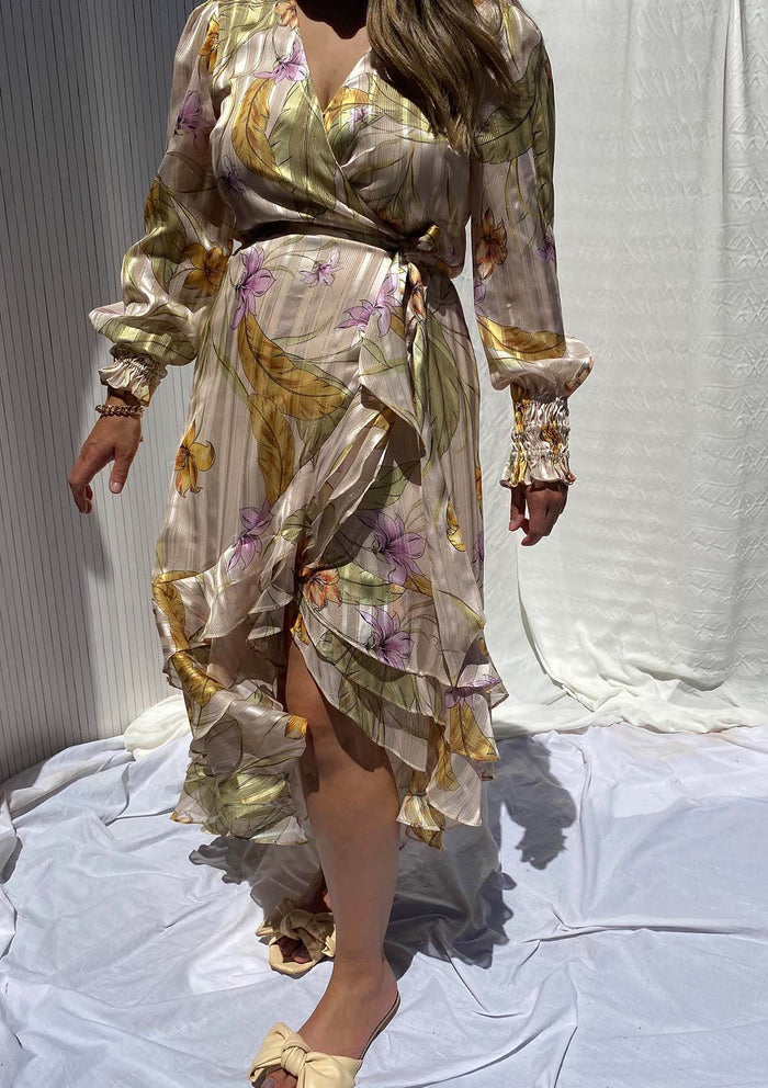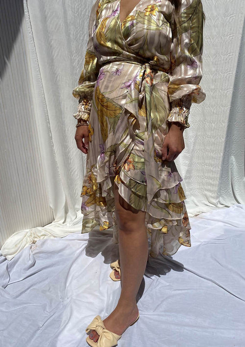 Make beautiful memories in this romantic mid-length wrap dress. The fully adjustable wrap design allows you to tie the waist according to your preference and shape. A press stud on the neckline allows you to further customise the fit. The high-low hem creates a beautiful, flowy line that is a dream to walk and dance in. The satiny, light floral fabric features a subtle gold lurex stripe detail. A double ruffled hemline, billowy long sleeves and ruched cuffs finish off the dreamy look beautifully. Perfect with strappy heels.