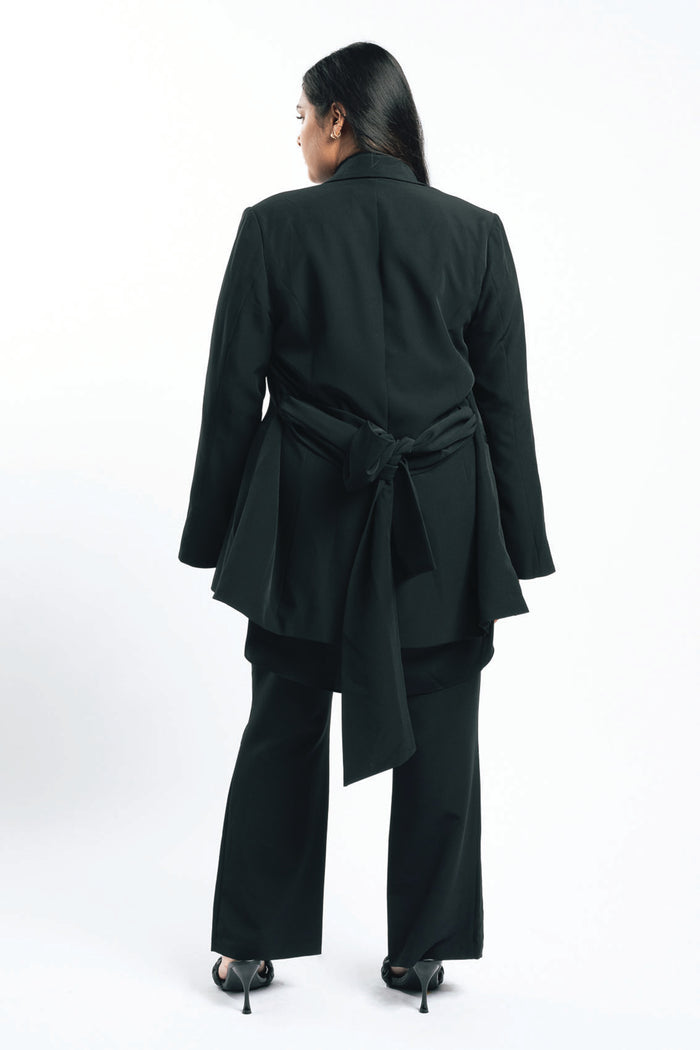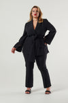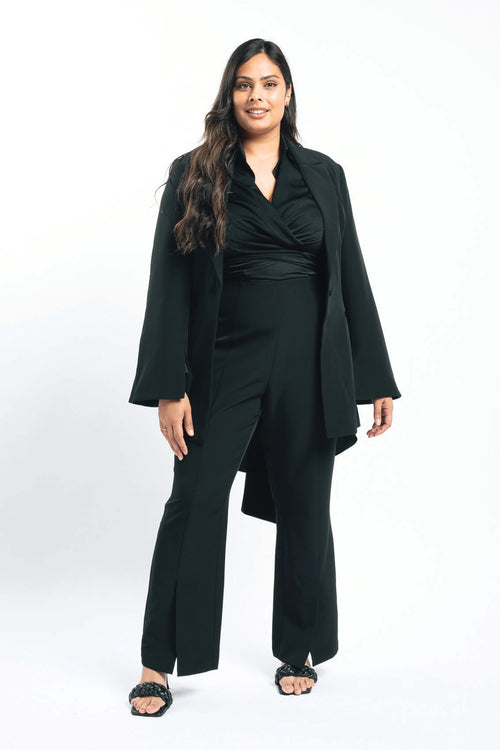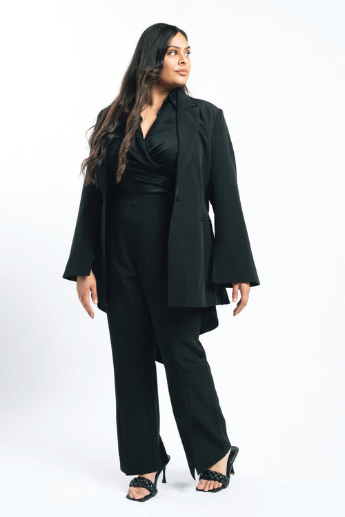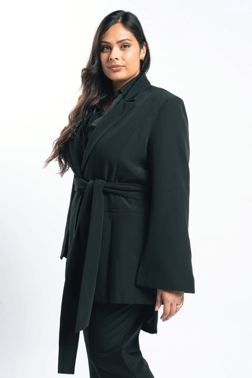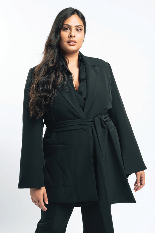 Your search for the perfect black blazer is over. This baby has been in the works for a while as we perfect a tailored fit and applied considered details especially for you. This one button blazer has a slightly off body fit, fit and fluted sleeves with splits at the cuff so you can display your favourite arm candy while wearing. Other features include a detachable wide sash waist tie and side body splits. It’s fully lined and just an all-round classic staple piece ready for its forever home